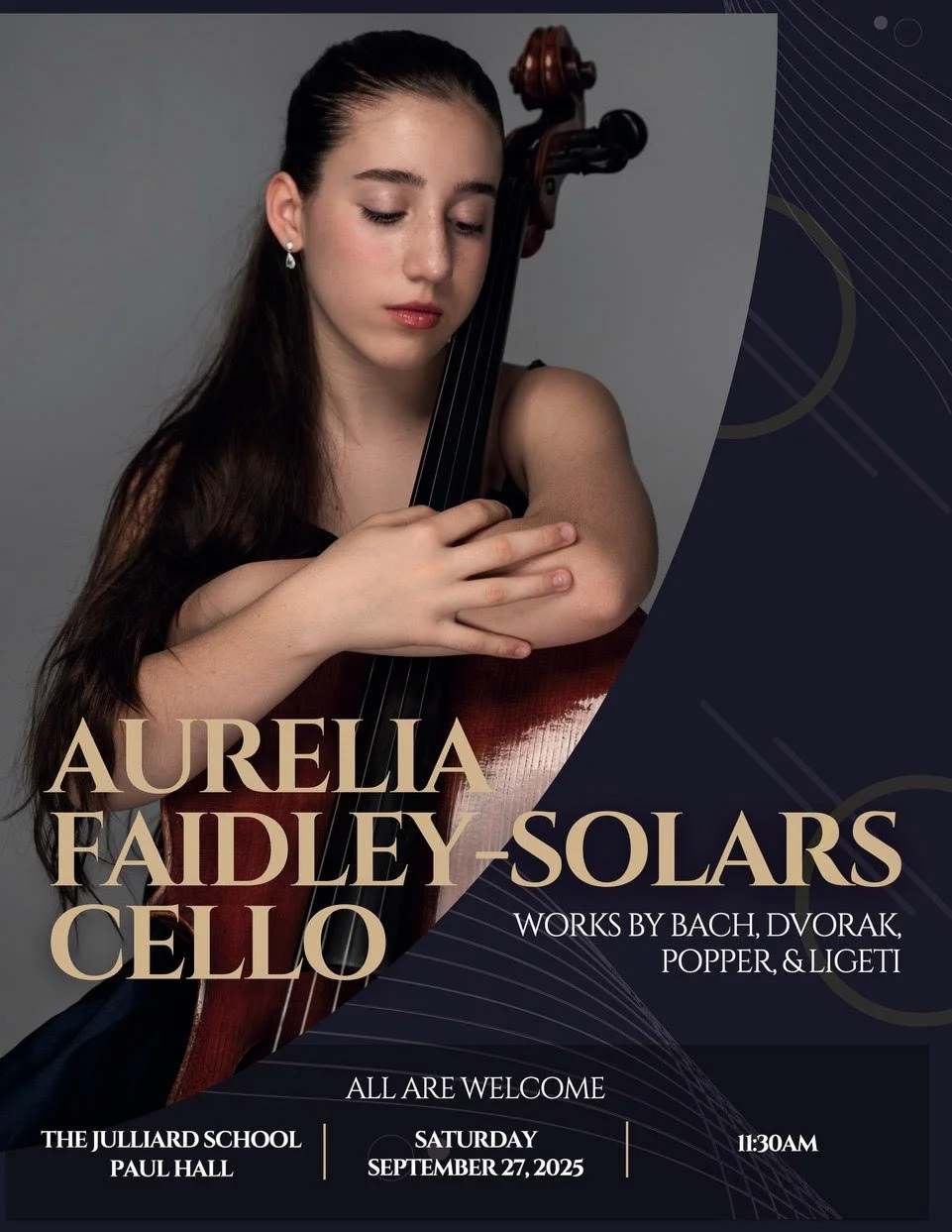 Aurelia Faidley-Solars is a 15-year old American cellist who has garnered international attention as a young concert artist. Aurelia currently studies at the Juilliard School of Music with Zvi Plesser and is the recipient of The Jacobs Scholarship of Music. She is also a 2023-2024 From the Top Fellow and the youngest Beare’s International Artist. In October, 2024, Aurelia opened for Ray Chen at The Colburn School in Los Angeles, performing with renowned pianist Julio Elizalde. Aurelia is the youngest winner of the 2025 Young Arts Competition… continue